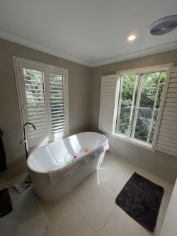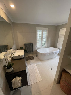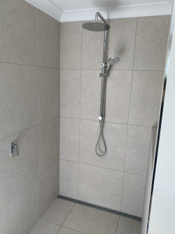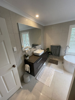 We then installed compressed fibre cement sheeting as the new under tile flooring so we could waterproof, fit tile bed & tiles without worrying about movement in the floor to cause waterproofing problems down the track. We replaced the old spa with a free standing bath and floor mounted spout. The shower is an open style with no glass screen.