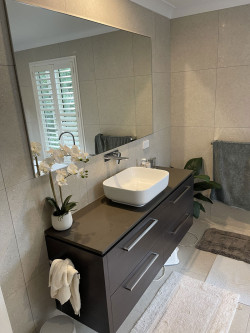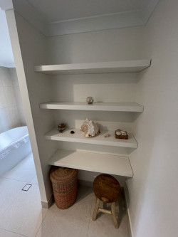 The vanity was custom made wall mounted with top mounted basin & wall mounted mixer tap & spout. The vanity has 4 drawers made to easily access everything inside. The drawers had to be made so they fitted tightly around the pipework.