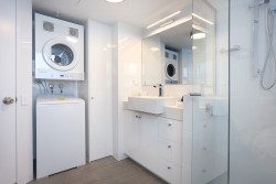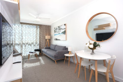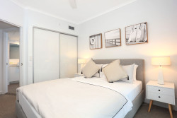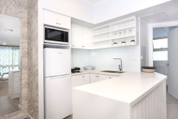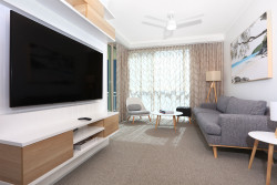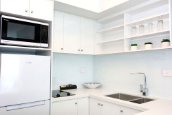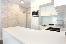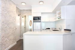 Timing on this renovation was of high importance to maximise rental return for a holiday period. The owner chose coastal beach theme with elements of luxury included with the wallpaper feature walls and custom made entertainment feature wall. A surprising amount of storage was added into this one bedroom holiday unit.