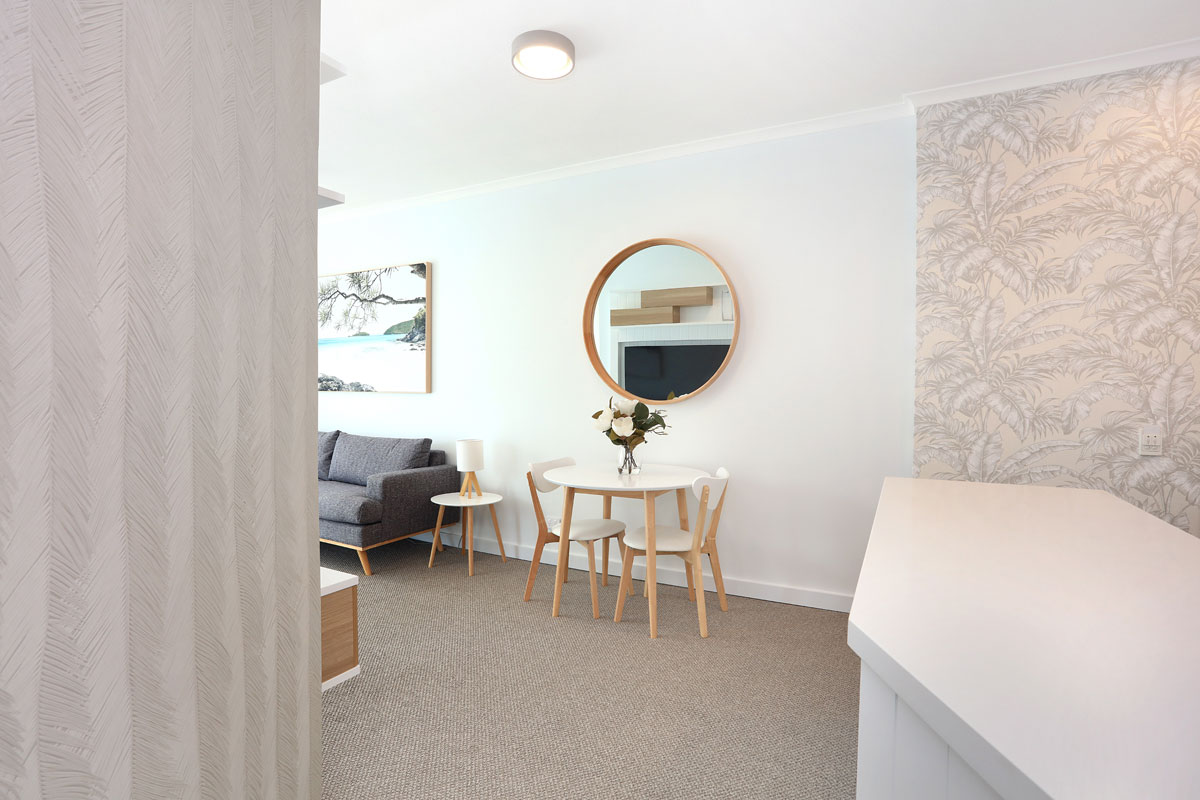 Timing on this renovation was of high importance to maximise rental return for a holiday period. The owner chose coastal beach theme with elements of luxury included with the wallpaper feature walls and custom made entertainment feature wall. A surprising amount of storage was added into this one bedroom holiday unit.
