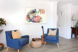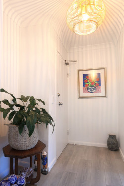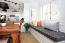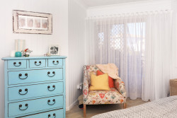 We replaced the existing tiles and carpet with hybrid flooring. VJ panelling was featured in the kitchen cabinetry, some walls and on the storage day seat we constructed. A fresh coat of white on white paint tied the style together beautifully.