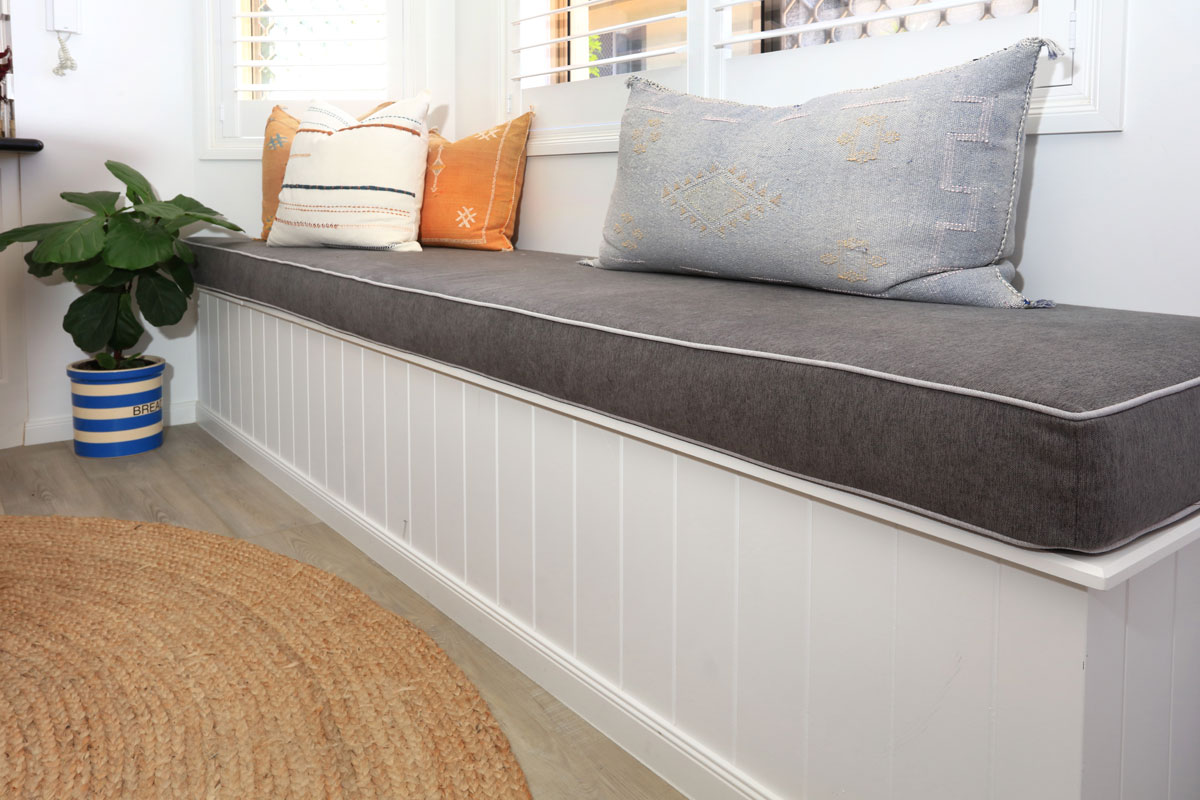 We replaced the existing tiles and carpet with hybrid flooring. VJ panelling was featured in the kitchen cabinetry, some walls and on the storage day seat we constructed. A fresh coat of white on white paint tied the style together beautifully.