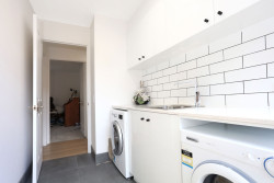 We updated this family home with a modern kitchen, including a butler’s pantry, laundry, bathroom, powder room, lounge, dining, front entry, and new staircase.